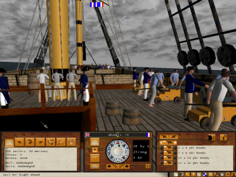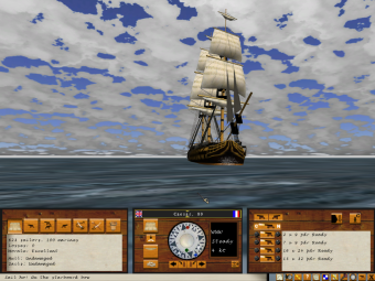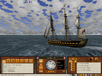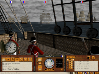 Ship of the Line is played entirely from a first person perspective. The player is positioned on board his ship, and is free to move around the deck, looking out at the unfolding battle around him. A simple clickable interface gives the player access to controls for directing his own ship, including setting and changing course, increasing or reducing sail, loading and firing the various ship's guns (using various types of ammunition), and assigning crew to different priorities (including manning the port guns, the starboard guns, changing sail or boarding).