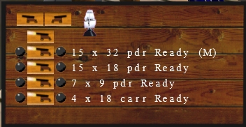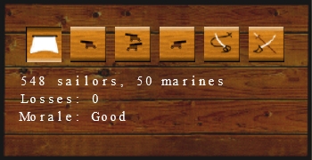 The crew controls, where current crew priorities are set. Options are: sails, which will allow for faster sail changes and generally more nimble handling of the ship; left or right broadsides, or both - manning both broadsides at once is possible, but reloading will be very slow; boarding parties, which will attempt to board any grappled enemy ships; and repel boarding parties - to keep boarders from larger enemies off your own ship. Below are indications of current crew strength, losses and morale. Sailors are rated in the game as landsmen, ordinary seamen or able seamen - in career mode crews can gain experience, and better crews give useful bonuses in reload time, sail changes and boarding actions.