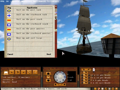 Looking back in this shot to a ship of the player's squadron, while composing a signal - in this case, the signal book is open on the page for sailing instructions. Signals are available to control absolute heading, heading in relation to the wind, sail setting, formation and targetting.